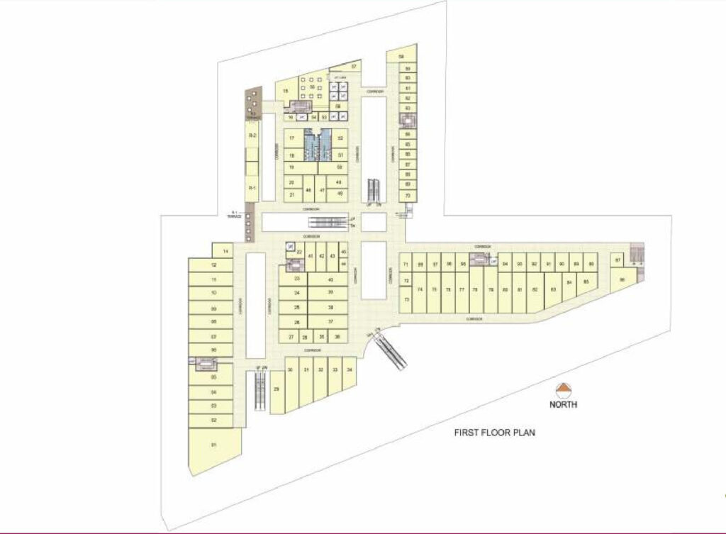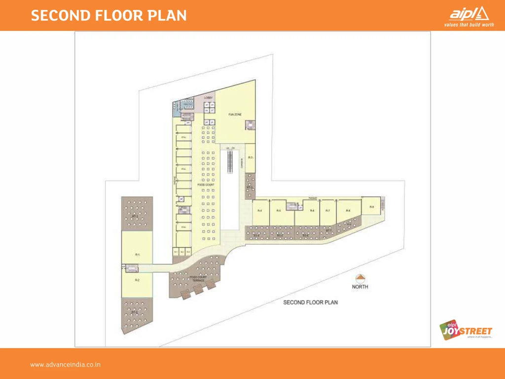 The AIPL Joy Street floor plan includes retail shops, serviced apartments, office spaces, and food courts.