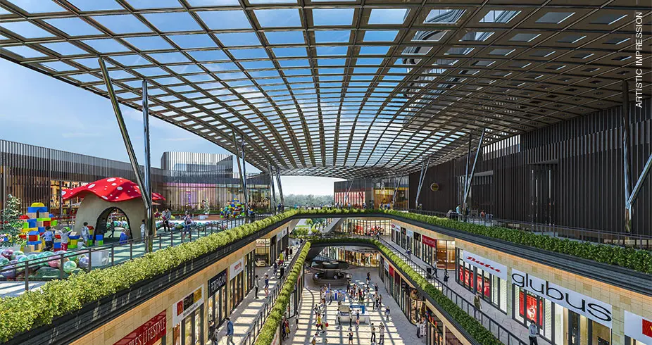 Multi-level parking, green spaces, and retail synergy drive success.